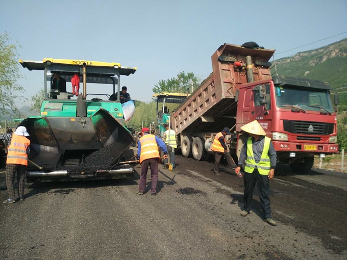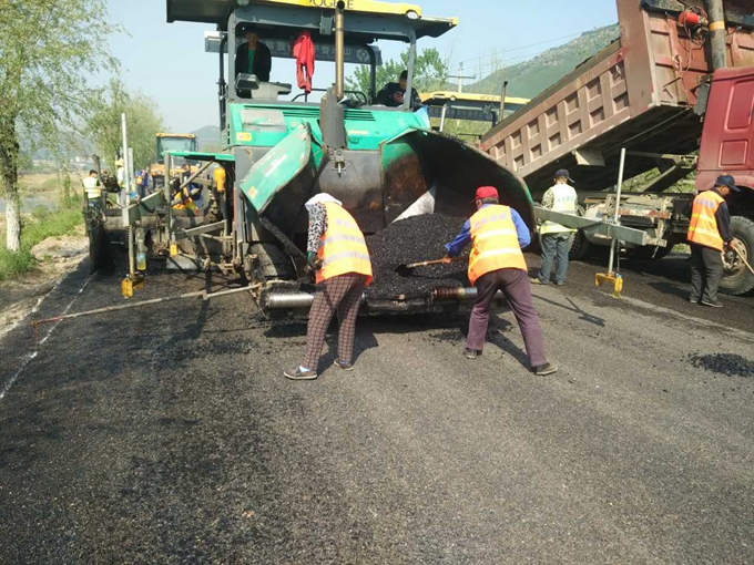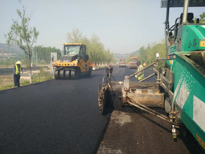 南崔路瀝青攤鋪施工現(xiàn)場,機(jī)械設(shè)備都在忙碌的工作中。