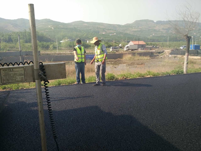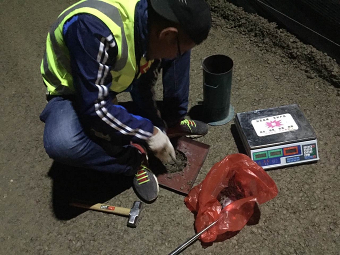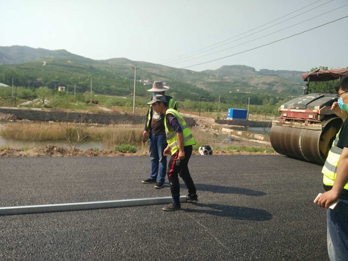 南崔路瀝青攤鋪現(xiàn)場,施工員焦守強(qiáng)跟機(jī)檢測。