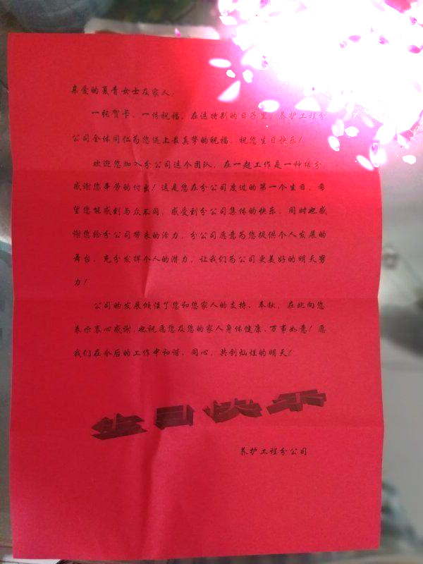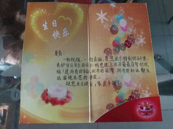 我自參加工作以來(lái)第一次去到公路施工第一線(xiàn),常駐工地才切身體會(huì)到了身在工地不能按時(shí)回家的辛苦。早在6月份時(shí),養(yǎng)護(hù)分公司辦公室人員就提前詢(xún)問(wèn)大家的生日,我們也因此早知道公司要給大伙祝賀生日,可當(dāng)我真正收到賀卡、蛋糕、禮物的時(shí)候,心里還是非常感動(dòng),心情非常激動(dòng),由衷的感謝公司各位領(lǐng)導(dǎo)的關(guān)愛(ài)。