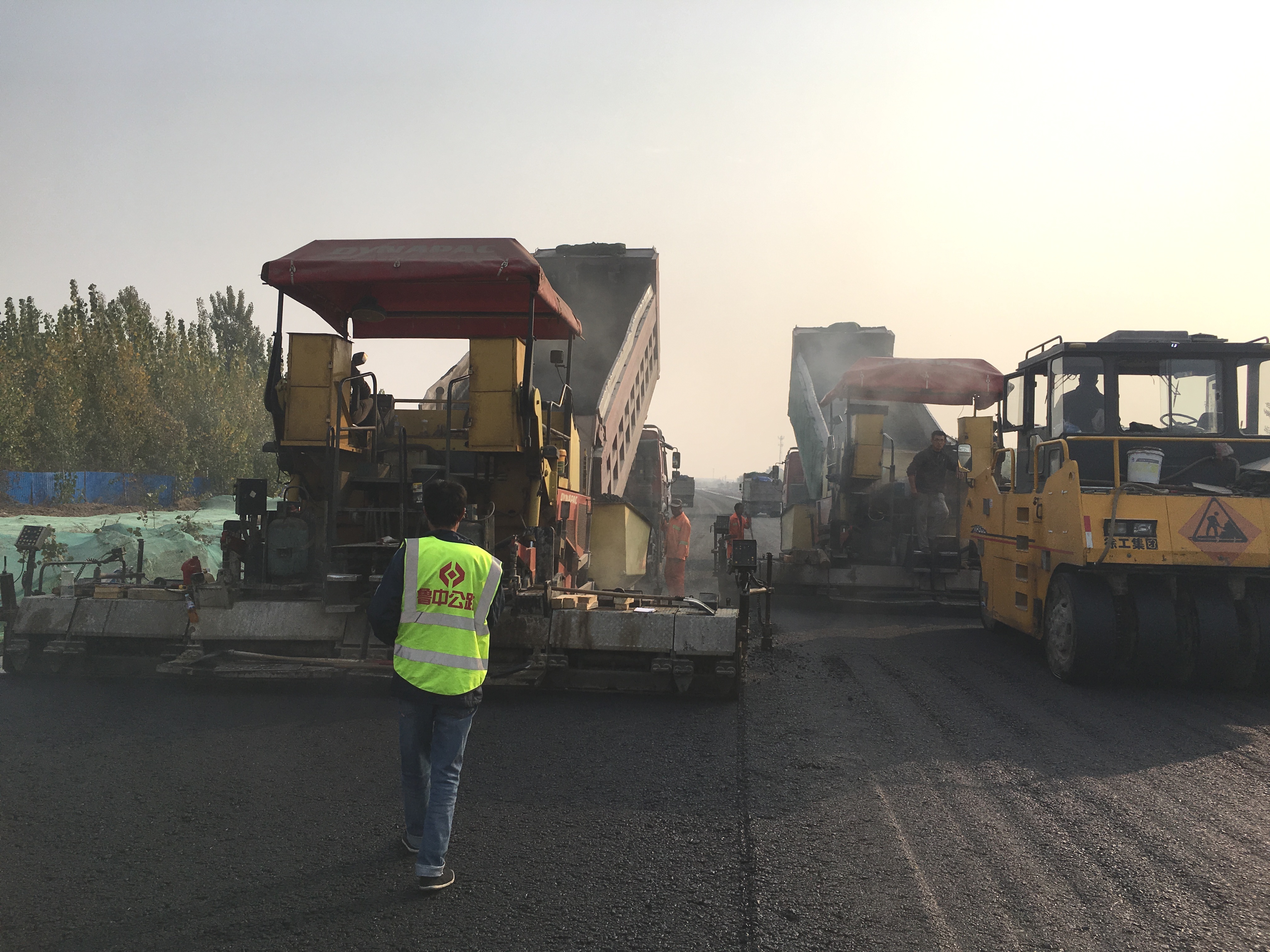 在精心準(zhǔn)備下,11月7日,我部順利完成了200米瀝青下面層試驗段攤鋪工作。此次試驗位于K10+540-K10+740段左幅,施工現(xiàn)場采用2臺攤鋪機(jī)半幅連續(xù)攤鋪壓路機(jī)跟進(jìn)壓實的施工工藝,經(jīng)過5個多小時緊張的施工,最終完成了AC-25C下面層試驗段的試鋪。攤鋪過程中,項目部領(lǐng)導(dǎo)及主要管理人員全程堅守在施工現(xiàn)場,從壓路機(jī)清潔、溫度控制、攤鋪厚度、壓實度、平整度、現(xiàn)場檢測等各個環(huán)節(jié)嚴(yán)格把關(guān),確保試驗過程和結(jié)果符合設(shè)計指標(biāo)、技術(shù)規(guī)范和安全質(zhì)量要求。