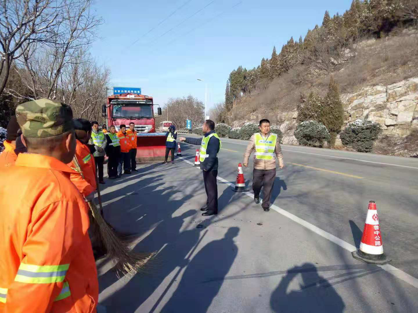 此次演練包括惡劣天氣預(yù)警、報(bào)告并啟動(dòng)應(yīng)急預(yù)案、防雪防滑應(yīng)急小組奔赴指定地點(diǎn)進(jìn)行除雪防滑作業(yè)、預(yù)警解除、匯報(bào)總結(jié)等五項(xiàng)內(nèi)容。演練從值班人員接到巡查人員的通知開始:博沂路K17+000處路面積雪影響車輛通行。值班人員按照聯(lián)勤方案通知交警和路政。養(yǎng)護(hù)工區(qū)接到通知后組織人員、機(jī)械趕赴指定地點(diǎn)開始除雪防滑作業(yè),相關(guān)車輛進(jìn)行撒布融雪劑及其它相關(guān)工作,本次演練啟動(dòng)除雪車2臺(tái)、融雪劑撒布車2臺(tái),整個(gè)演練持續(xù)40分鐘,共有30人參加。