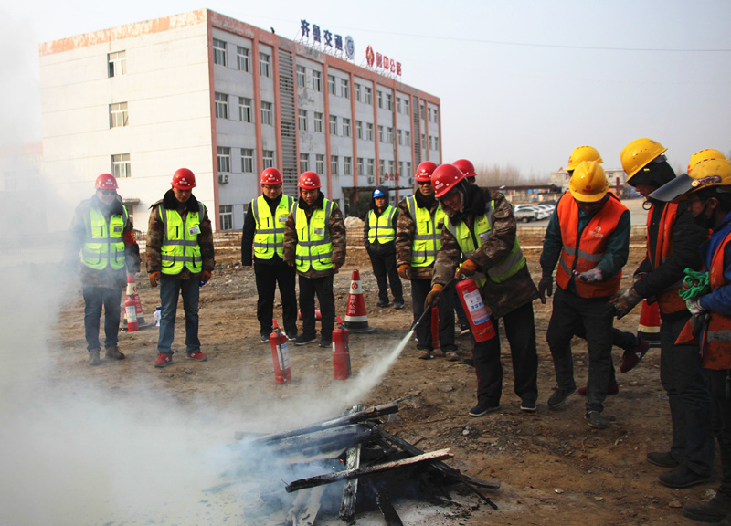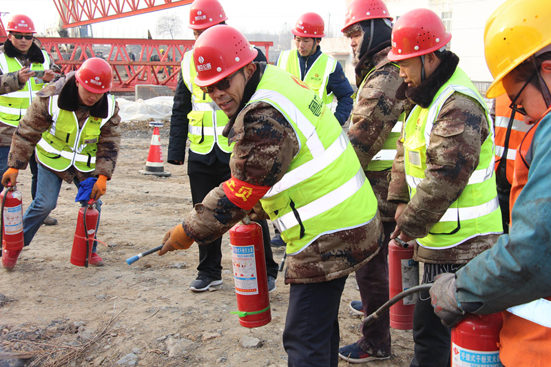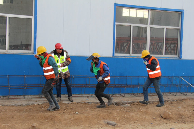 演練當(dāng)天現(xiàn)場氣溫達到零下9攝氏度,寒風(fēng)肆虐。演習(xí)開始后,伴隨著急促的火災(zāi)警報聲,演習(xí)現(xiàn)場濃煙滾滾,火借風(fēng)勢迅速蔓延。面對危急形勢,項目部立即啟動安全應(yīng)急預(yù)案,迅速組織搶險救援組攜帶滅火器進入現(xiàn)場進行滅火。為避免火勢蔓延,通訊聯(lián)絡(luò)組第一時間與消防部門進行聯(lián)系,請求支援,同時,迅速指揮火場人員撤退,演習(xí)人員在現(xiàn)場指揮人員的組織和引導(dǎo)下,手拿濕毛巾捂住口鼻,彎腰快速通過火場到達安全地帶。警戒保衛(wèi)組同步設(shè)置警戒線,疏散無關(guān)人員,醫(yī)療救護組同時也抵達現(xiàn)場,對受傷工人進行救治。經(jīng)過幾分鐘的撲救,最終火勢被順利撲滅?;馂?zāi)撲滅后,善后處理組對火災(zāi)現(xiàn)場做進一步排查,尋找、總結(jié)火災(zāi)出現(xiàn)的原因,確保安全隱患徹底排除。
