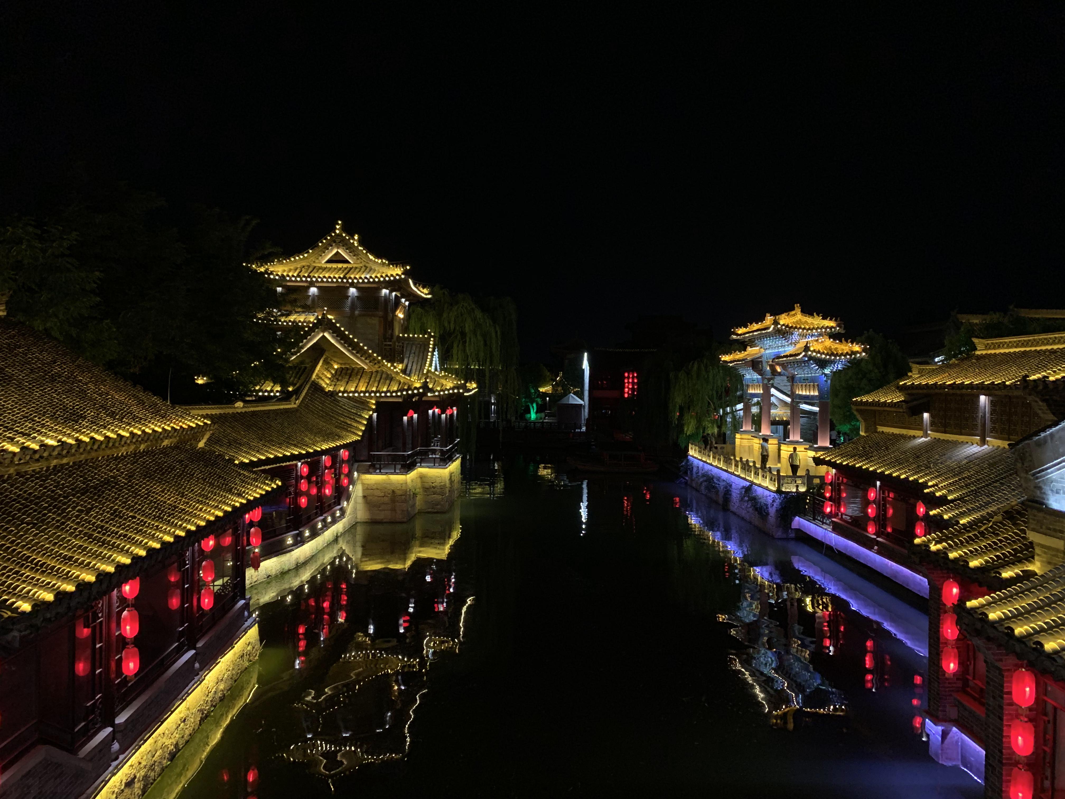 到了臺(tái)兒莊古城已是星光閃爍的時(shí)分,這座不夜的古城里面倒是熱鬧非凡,青石路上人群熙攘,湖面上蕩漾著游船,船篷上紅燈點(diǎn)點(diǎn),湖畔香樟樹隨風(fēng)輕擺,如夢(mèng)如幻。用過晚餐,年輕人們迫不及待的組隊(duì)去揭開這古城的神秘面紗。
