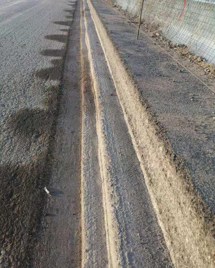 由于改裝的銑刨機(jī)是在右后方增加一個銑刨鼓,所以銑刨機(jī)的重心轉(zhuǎn)移到右后輪,在調(diào)轉(zhuǎn)的過程中,左幅大部分上坡道不是無法承重,就是寬度不足,導(dǎo)致每次調(diào)轉(zhuǎn)都是一個大問題。后來想著從橋面上通過,于是利用銑刨老路臺階的銑刨料墊路,有壓路機(jī)壓實,當(dāng)?shù)谝淮螐臉蛎嫔贤ㄟ^時,心情無比的激動,因此銑刨工作大大提高了效率?,F(xiàn)在導(dǎo)改之后,右幅是在老路路面上銑刨,沒有了左幅的那些困難,銑刨出來的順直度也比左幅好一些,這就是銑刨臺階的故事。