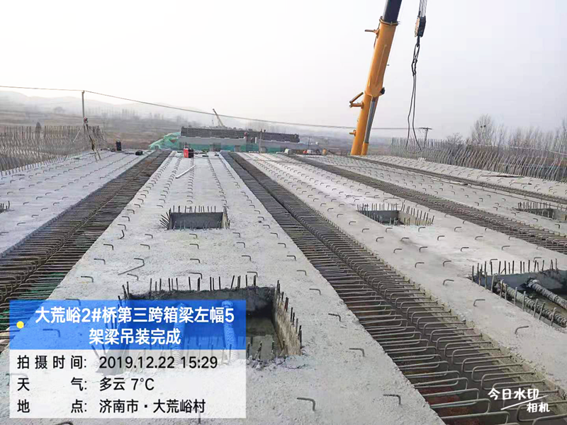 青蘭二標(biāo)設(shè)計箱梁624片,目前已經(jīng)完成梁板預(yù)制265片,計劃預(yù)制完成時間為5月31日,預(yù)計9月份全部架設(shè)完畢,確保實現(xiàn)總工期目標(biāo)。受現(xiàn)場高壓線、通信線路等影響,全線根據(jù)實際情況分別采用汽吊、架橋機進行梁板安裝。大荒裕2#橋全長179.2m,橋面凈寬31m,上部結(jié)構(gòu)采用(2×25.5+25)m+4×25m預(yù)應(yīng)力混凝土(后張)小箱梁,共計7孔。全橋共計25m箱梁50片,25.5m箱梁20片。2#橋段場地開闊,平整,采用130t和200t兩臺汽吊,兩端抬梁架設(shè)。
