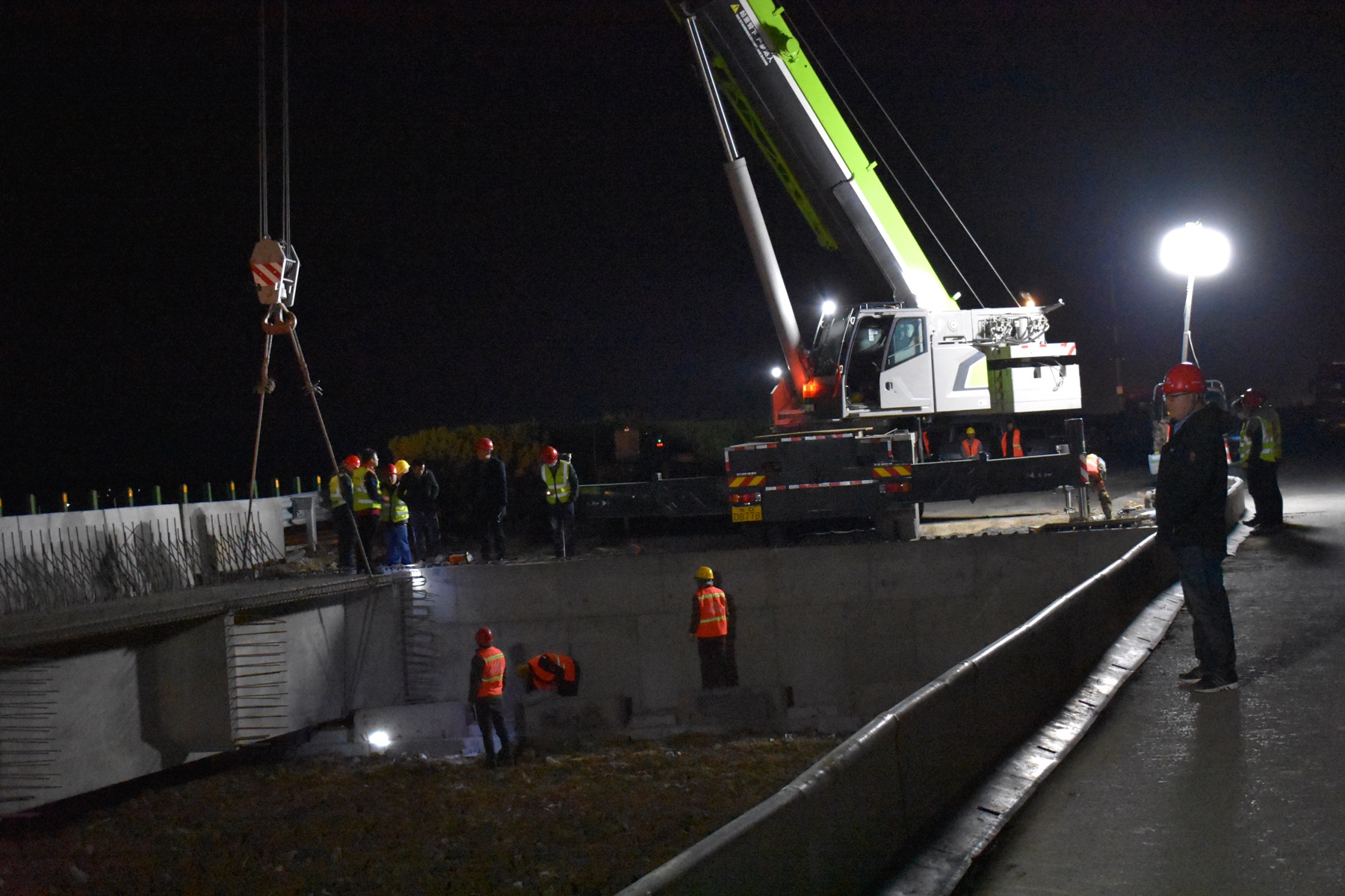 4月13日凌晨3:00,膠新鐵路橋最后一片T梁安裝完成。
