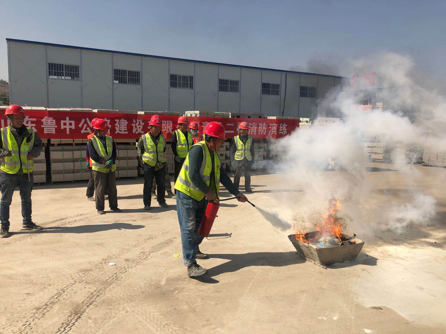拌合站人員和民工隊伍依次學(xué)習(xí)如何正確使用干粉滅火器來有效快速消滅火情。