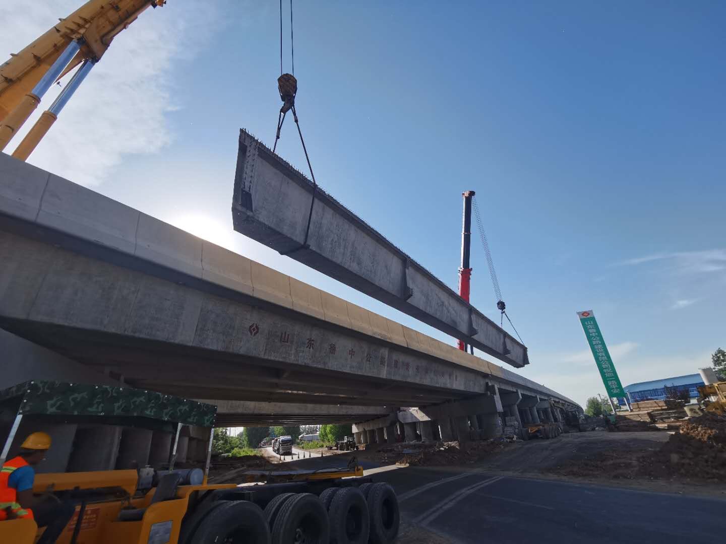 京滬高速公路萊蕪至臨沂段改擴建工程第十標(biāo)段,由齊魯交通發(fā)展集團投資,山東魯中公路建設(shè)有限公司承建,起訖點樁號K692+900-K710+000,路線全長17.1km(含紅花埠互通一處、主線收費站一處),設(shè)計速度120km/h,按雙向八車道標(biāo)準(zhǔn)進行擴建。我部于2020年1月18日率先完成第四階段全幅交通導(dǎo)改,右幅雙向通行,左幅封閉施工,進行左幅老橋拆除新建和路面施工。其中K693+964.355歸昌特大橋,全長共1233m,共14聯(lián),是我標(biāo)全線唯一的特大橋,也是全線重點控制工程之一,歸昌特大橋1-3聯(lián)上部結(jié)構(gòu)形式采用現(xiàn)澆普通鋼筋砼空心板、第10、12聯(lián)采用普通鋼筋砼現(xiàn)澆板(拆除新建)、第4-9、13、14聯(lián)采用預(yù)應(yīng)力砼(先張)橋面連續(xù)空心板(20m共435片,22.31m共5片)、第11聯(lián)采用預(yù)應(yīng)力砼(后張)簡支小箱梁(40m共14片),下部結(jié)構(gòu)采用柱式墩+肋板臺。預(yù)制箱梁所處位為歸昌特大橋第11聯(lián)拆除新建,上跨G310國道,車流量較大,施工吊裝難度風(fēng)險大,為確保歸昌特大橋左幅最后5片預(yù)制箱梁順利架設(shè),我部首先進行優(yōu)化施工方案、細(xì)化工作計劃、強化施工組織,成立專門的領(lǐng)導(dǎo)小組,合理進行資源配置,然后施工前對現(xiàn)場施工人員進行安全、質(zhì)量技術(shù)交底,讓現(xiàn)場每位施工人員能夠熟悉架梁流程及施工安全注意事項,提高安全生產(chǎn)意識,嚴(yán)格按照技術(shù)規(guī)范及要求精細(xì)架設(shè)。5月10日我部開始進行箱梁吊裝前一系列準(zhǔn)備工作,本次吊裝采用2輛400t汽車吊雙機起吊的形式進行施工,在箱梁運輸和架設(shè)過程中,項目部領(lǐng)導(dǎo)親自在現(xiàn)場指揮,我部克服了天氣及運梁線路條件復(fù)雜、上跨G310國道等不利因素,在全體人員的共同努力下,于5月11日晚20:10分將左幅最后5片預(yù)制箱梁全部順利吊裝到位,實現(xiàn)主線全線貫通。