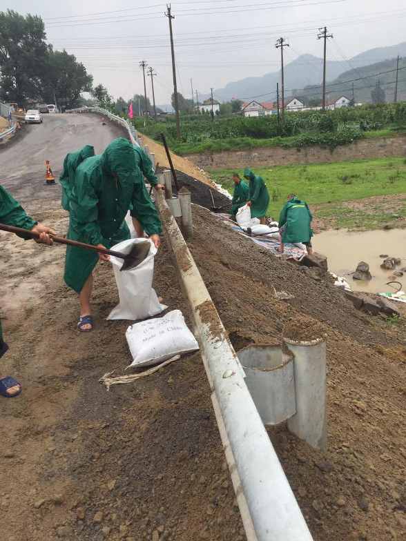 人員部署完畢,當(dāng)晚19:00,烏云密布,狂風(fēng)怒吼。兩組負(fù)責(zé)人帶領(lǐng)挖掘機(jī)、裝載機(jī)及各值班人員到達(dá)現(xiàn)場。姚慶敏經(jīng)理高度重視,親臨一線指揮防汛工作,在現(xiàn)場要求大家要以“以汛為令、眾志成城、集中精力、各負(fù)其責(zé)”以“北博山中橋便道被毀壞事件”為戒,全力以赴防汛排澇,保障居民財(cái)產(chǎn)安全。