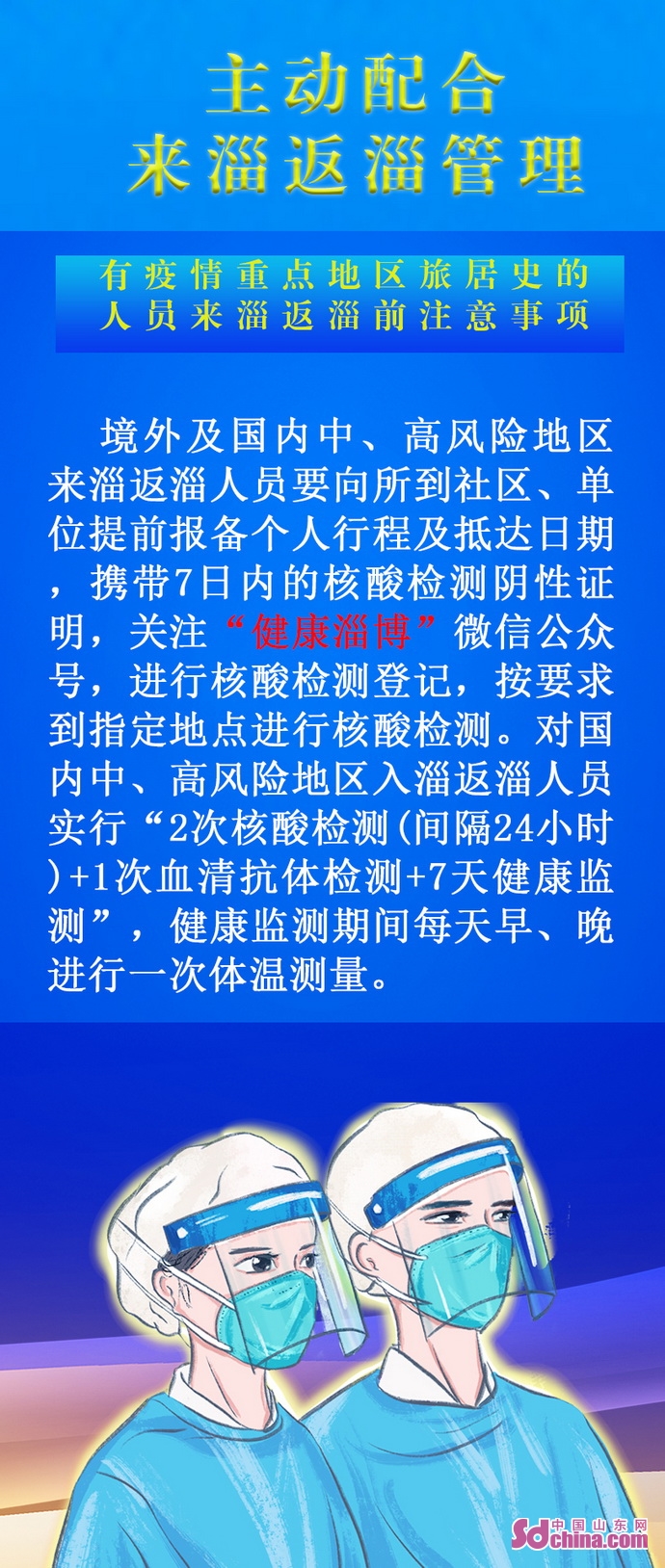 來淄返淄人員應積極響應疫情防控要求,境外及國內中、高風險地區(qū)來淄返淄人員須提前向所到社區(qū)(村居)和單位如實報告行程。攜帶7日內核酸檢測陰性證明,關注“健康淄博”公眾號,進行核酸檢測登記,并按要求到指定地點進行核酸檢測。國內中、高風險地區(qū)來淄返淄人員務必做到“2次核酸檢測(間隔24小時)+1次血清抗體檢測+7天健康監(jiān)測”,健康監(jiān)測期間配合社區(qū)(村居)人員每天早、晚監(jiān)測一次體溫。