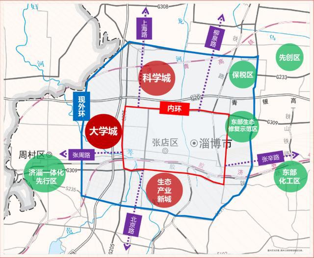 淄博中心城區(qū)已相對成熟,而破題“西融、北聯(lián)、南拓、東優(yōu)”功能區(qū)則因為大量的留白,可塑性較強,發(fā)展?jié)摿薮蟆?br /> 在西外環(huán)姜萌路所穿過的功能區(qū)有兩個,一個是大學(xué)城,一個是濟淄同城化先行先試區(qū),其中,大學(xué)城是張周兩城融合的關(guān)節(jié)所在;而濟淄同城化先行先試區(qū)則是,強化省會經(jīng)濟圈中的中心城市(濟南)和副中心城市(淄博)的同城效應(yīng),以及加強濟淄兩市深度合作的關(guān)鍵。可以這么說,西外環(huán)路所穿行的區(qū)域承載著張店與周村融合發(fā)展,甚至是淄博與濟南深度合作的未來。