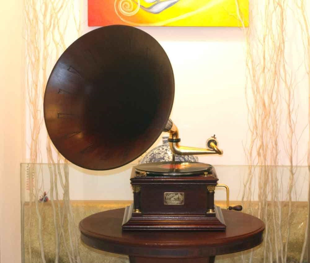 由于酷愛京劇,一年幾次的演出,根本滿足不了父親酷愛京劇的欲望,所以就想到了當(dāng)時(shí)非常時(shí)尚的留聲機(jī)。那個(gè)年代想買個(gè)留聲機(jī),是個(gè)想也不敢想的事。當(dāng)時(shí)父親是橫下了一條心,首先要過娘的這一關(guān),他是忍受了娘不住的埋怨,又想盡一切辦法在朋友中湊錢。父親是個(gè)從不愿張口向人借錢的人,這次破例得到了朋友的幫助,把錢湊齊了。最終把留聲機(jī)搬回了家。用父親的話說:"我把四大名旦請(qǐng)回家了,還怕沒戲聽啊"!就這樣留聲機(jī)從此就住進(jìn)了我們的家。留聲機(jī)像一位尊貴的客人,它的"地位"是顯赫的,(放在我們房間里最顯眼的地方),它有非常華麗的"服裝",(黑褐色的留聲機(jī)的盒子上蓋著一塊紅綢大方巾),旁邊放著一個(gè)比它高一點(diǎn)的放唱片的盒子,是那么的厚重,大氣。從此我們家每個(gè)晚上都是高朋滿坐,留聲機(jī)是主角兒,我父親與留聲機(jī)永遠(yuǎn)是默契的搭當(dāng)。過了一段時(shí)間,來聽?wèi)虻娜嗽絹碓蕉啵葑幼幌铝?,于是就轉(zhuǎn)到院子里,再后來留聲機(jī)走出了家門,走出了村莊,遠(yuǎn)近幾個(gè)村莊,哪家有個(gè)喜事,我父親與留聲機(jī)必到,留聲機(jī)成了一個(gè)流動(dòng)的小舞臺(tái),它承載了父親的榮耀與快樂!