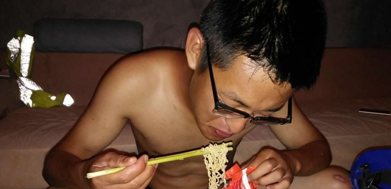 泡面的故事發(fā)生在橋隧工程分公司沂源橋梁項(xiàng)目6月中旬的樁基澆筑混凝土施工現(xiàn)場(chǎng)。當(dāng)晚王立超負(fù)責(zé)混凝土澆筑觀測(cè)工作,枯燥但卻要求有高強(qiáng)度的責(zé)任心,一站站一晚,崗在那人就得在那,容不得半點(diǎn)分心。工作完成卻已是深夜時(shí)間,原本想干啃方便面的他,看到地上剛巧有干凈的樹枝,就立馬撅了變成了一次性筷子,頭上的安全帽也派上了用場(chǎng),就著袋子裝上熱水,一古腦的成就了這頓豐盛的夜宵。