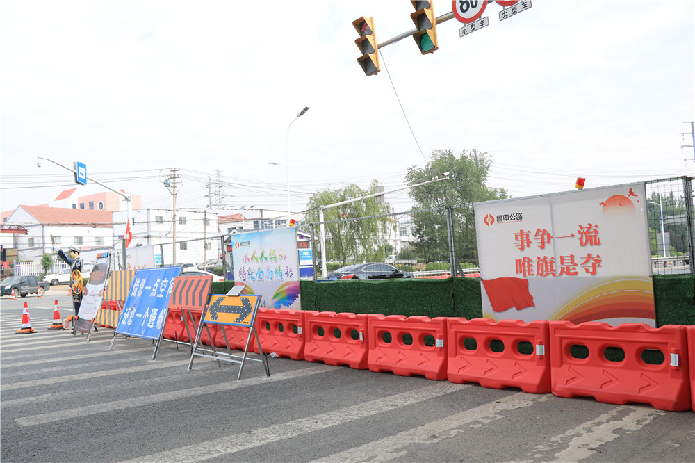 G205項(xiàng)目車流量大、交通形式復(fù)雜,交通組織是工程實(shí)施期間的頭等大事。項(xiàng)目部嚴(yán)格按規(guī)范要求布設(shè)交通封閉設(shè)施,細(xì)化交通提示牌和指示標(biāo)志,先后設(shè)置遠(yuǎn)端提示牌25塊,各類標(biāo)識(shí)標(biāo)牌近500塊,投入安全錐12000余個(gè),水碼1000余個(gè)。項(xiàng)目部組成50余人的安全隊(duì)伍負(fù)責(zé)交通疏導(dǎo),確保了施工期道路安全暢通,最大限度地降低了對(duì)群眾出行的影響。自開(kāi)工以來(lái),車輛往來(lái)秩序井然,周邊群眾出入正常有序,未發(fā)生一起因道路施工引起的交通擁堵和交通事故。