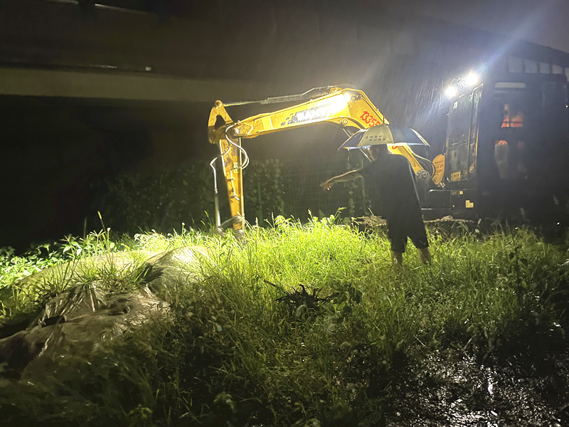 7月28日晚至29日凌晨,各項目按照會議部署分工,迅速展開行動。隨著雨勢增加,部分排水系統(tǒng)出現(xiàn)不同程度的堵塞積水,各負(fù)責(zé)值班人員及時協(xié)調(diào)挖機及抽水泵,及時對現(xiàn)場情況進(jìn)行處置。分公司領(lǐng)導(dǎo)靠前指揮,實時對現(xiàn)場情況進(jìn)行詢問,親自協(xié)調(diào)調(diào)度現(xiàn)場排水情況。值班人員以雨為令,落實值班值守制度,風(fēng)雨中全力拼搶,保證群眾人身不受傷害、農(nóng)田不被“侵犯”,一整夜,值班人員對現(xiàn)場負(fù)責(zé)區(qū)域進(jìn)行盯控排查,每小時對負(fù)責(zé)區(qū)域內(nèi)情況進(jìn)行報備,雨水與汗水交融,崗位與職責(zé)同在。