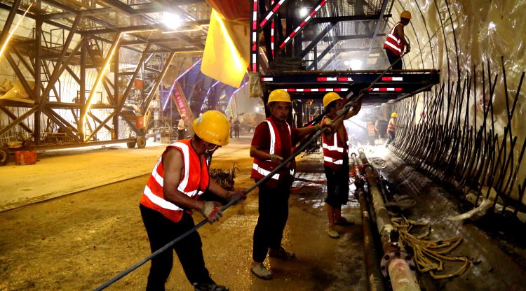 在盤頂山隧道內(nèi),工人們正在搬運鋼筋。