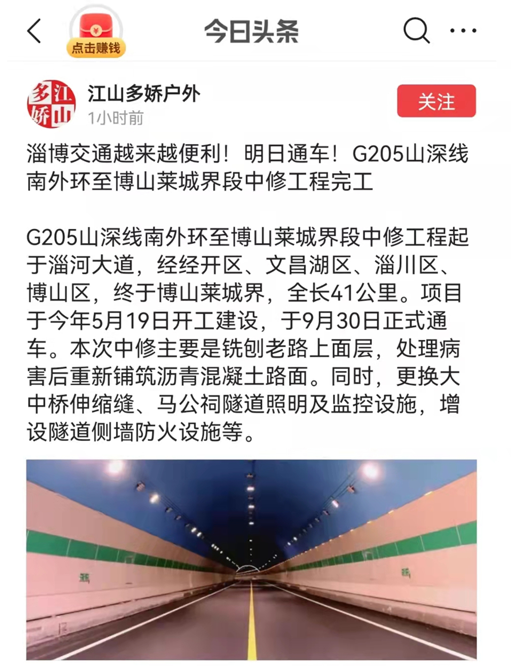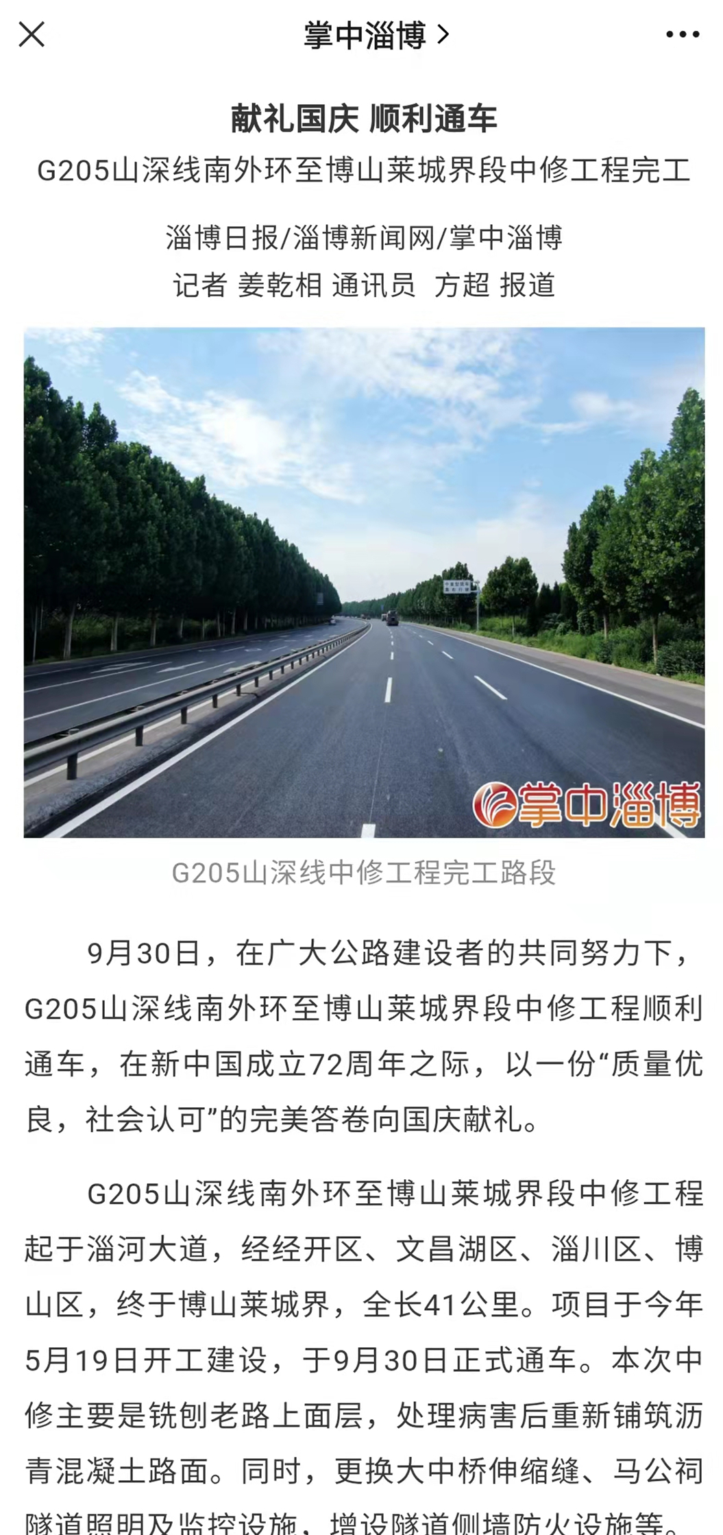 9月29日,就G205驗收并交付使用的消息網(wǎng)易、搜狐、澎湃新聞、今日頭條、淄博日報、淄博交通等各家媒體爭相報道,廣大市民紛紛轉(zhuǎn)發(fā),相互告知,成為國慶節(jié)前夕我市最熱門的新聞話題,也為魯中公路贏來一撥網(wǎng)絡熱搜。