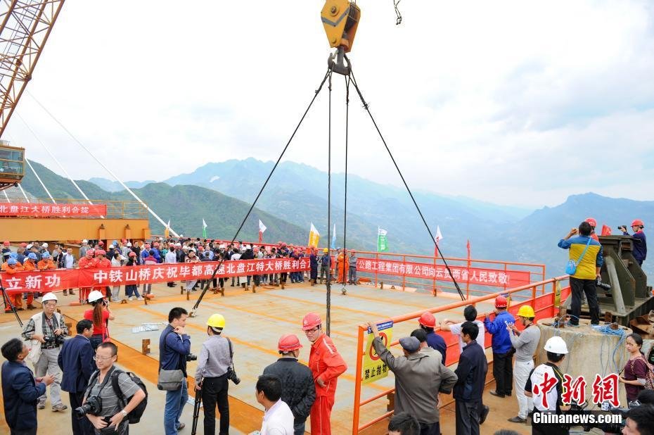 9月10日,由貴州、云南兩省合作共建的世界第一高橋——杭瑞高速貴州省畢節(jié)至都格(黔滇界)高速公路北盤江大橋?qū)崿F(xiàn)合龍。北盤江大橋是杭瑞高速畢都段的控制性工程,位于云南省和貴州省交界處,北盤江大橋橋面至江面高差達(dá)565米,超越之前世界第一高橋四渡河特大橋的560米,成為目前世界第一高橋,大橋主橋?yàn)殇撹炝盒崩瓨颍骺?20米,畢都高速公路全線預(yù)計(jì)今年底可建成通車。