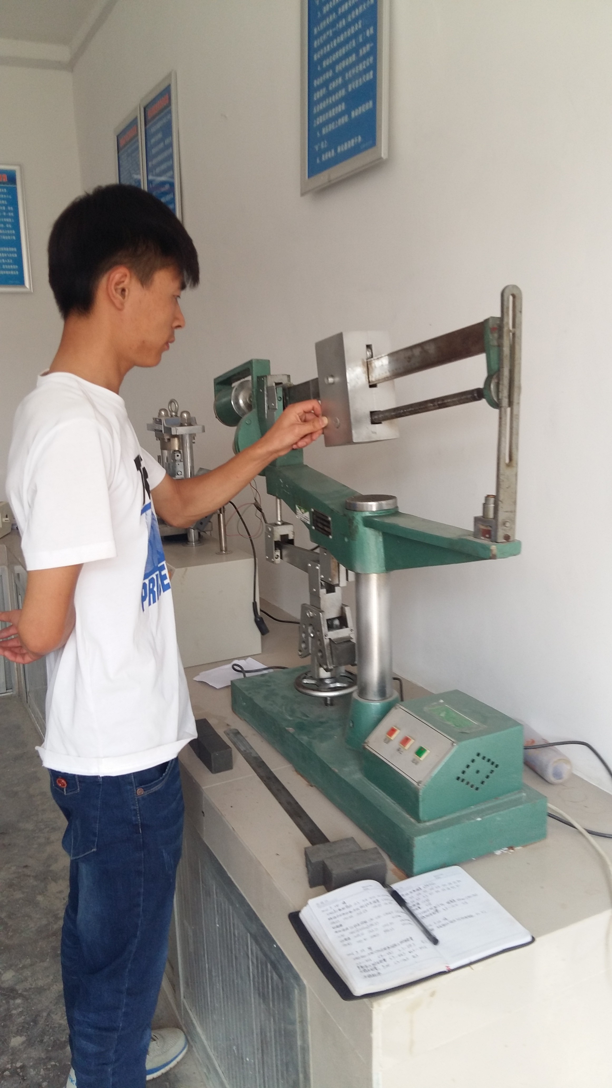 10月1日上午10:20,市政分公司試驗員武向東在進行水泥沙漿抗折試驗。