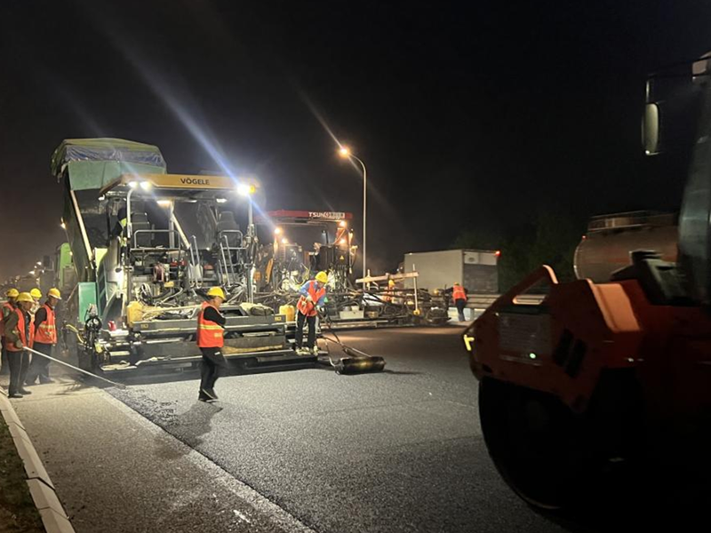 19:00,隨著晚高峰車流逐漸消散,G309青蘭線張周段項目起點至濱萊高速匝道橋下左幅路段瀝青攤鋪拉開帷幕——數(shù)十名項目部及安全隊伍人員迅速封閉高速路張店方向出口,運輸車、攤鋪機、壓路機、裝載機列陣待命,一場與時間賽跑的道路搶修正式啟動。